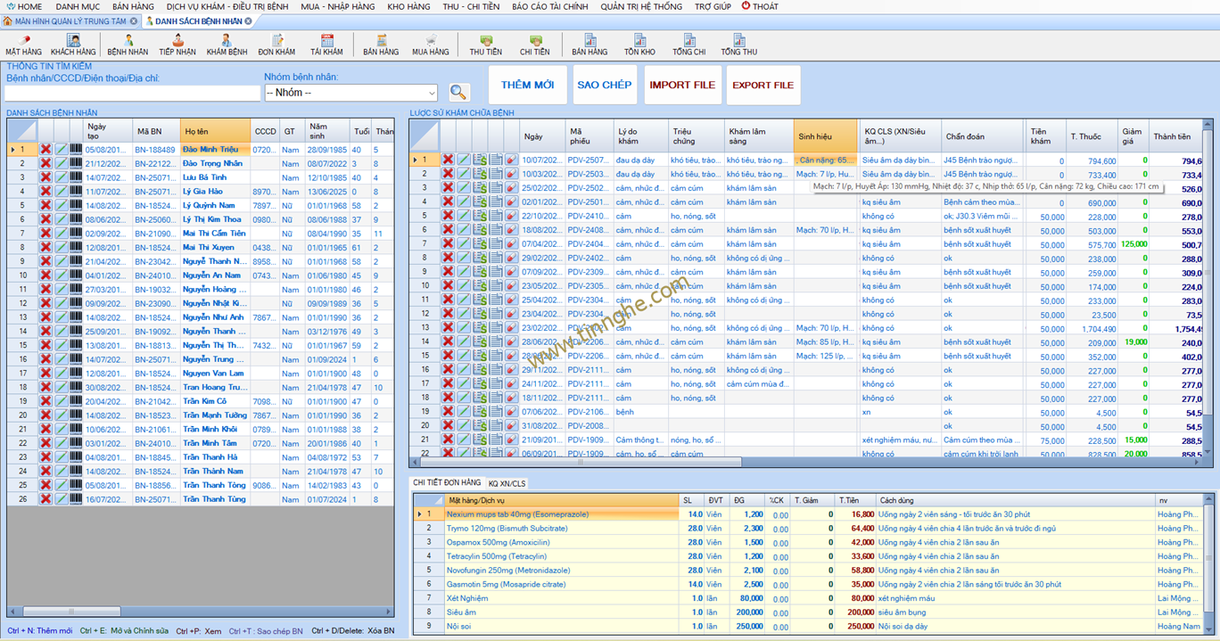 - Quản lý theo dõi dễ dàng danh sách bệnh nhân, lược sử khám (tiền khám bệnh, thuốc xuất, ngày khám, bác sỹ khám, chuẩn đoán bệnh, triệu chứng, xét nghiệm, công việc) ứng với từng bệnh nhân