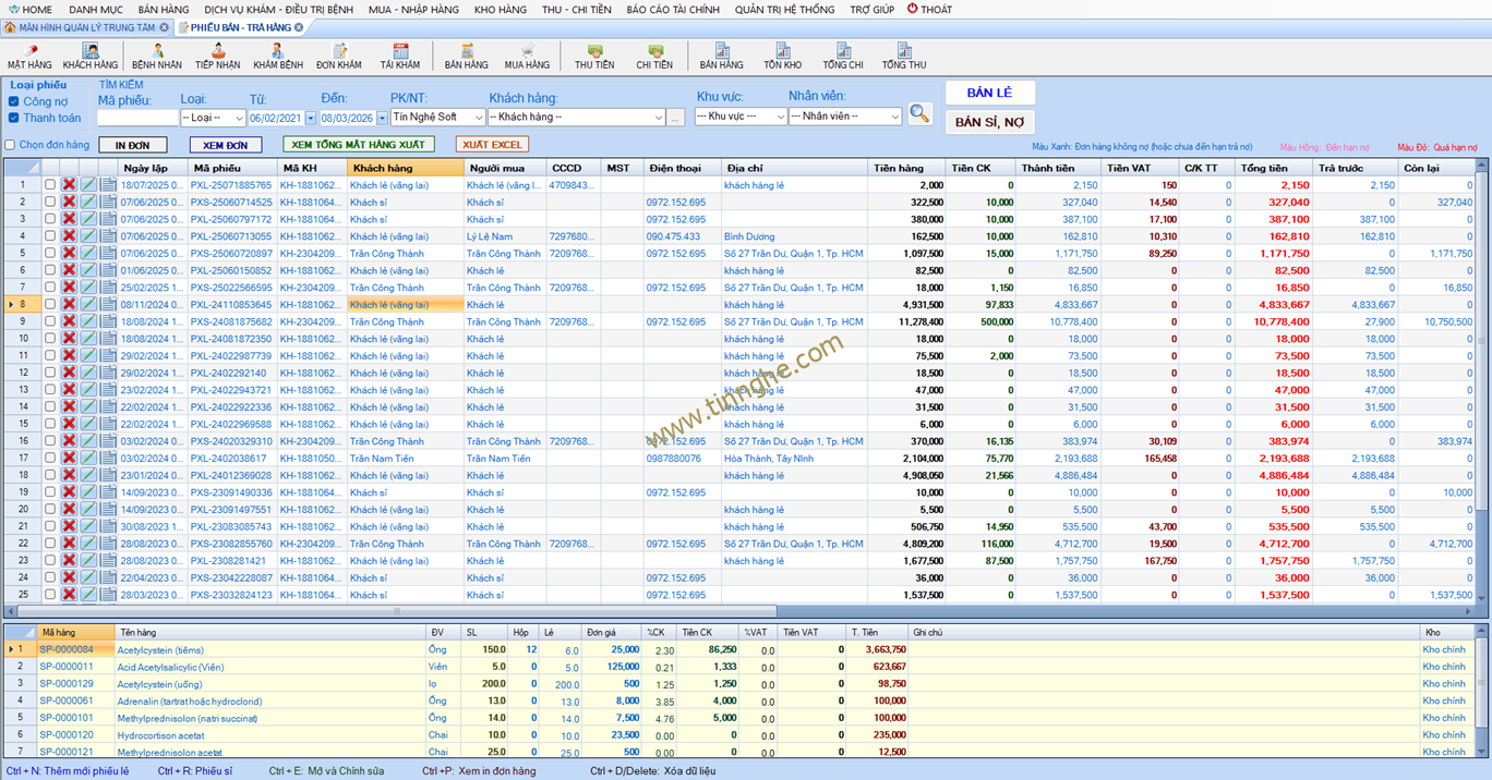 - Báo cáo công nợ và lược sử/sao kê giao dịch khách hàng (chi tiết giao dịch khám bệnh, mua hàng, trả tiền, ứng trước tiền, công nợ)