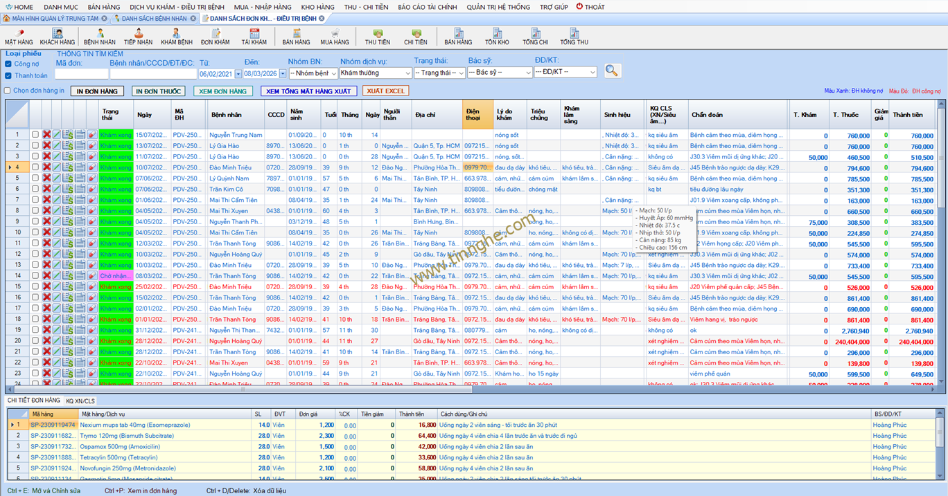 Danh sách đơn hàng khám điều trị bệnh, cho phép tìm kiếm theo: mã đơn hàng, Họ tên/CCCD/ĐT, ngày tháng, bệnh nhân, bác sỹ . Chức năng in ấn hàng loạt hóa đơn/đơn thuốc