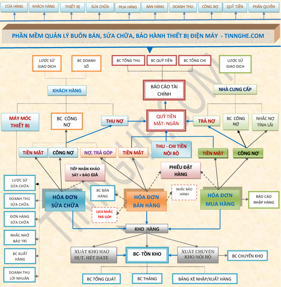 - Báo cáo công nợ và lược sử/sao kê giao dịch khách hàng (chi tiết giao dịch sửa thiết bị, mua hàng, trả tiền, ứng trước tiền, công nợ)