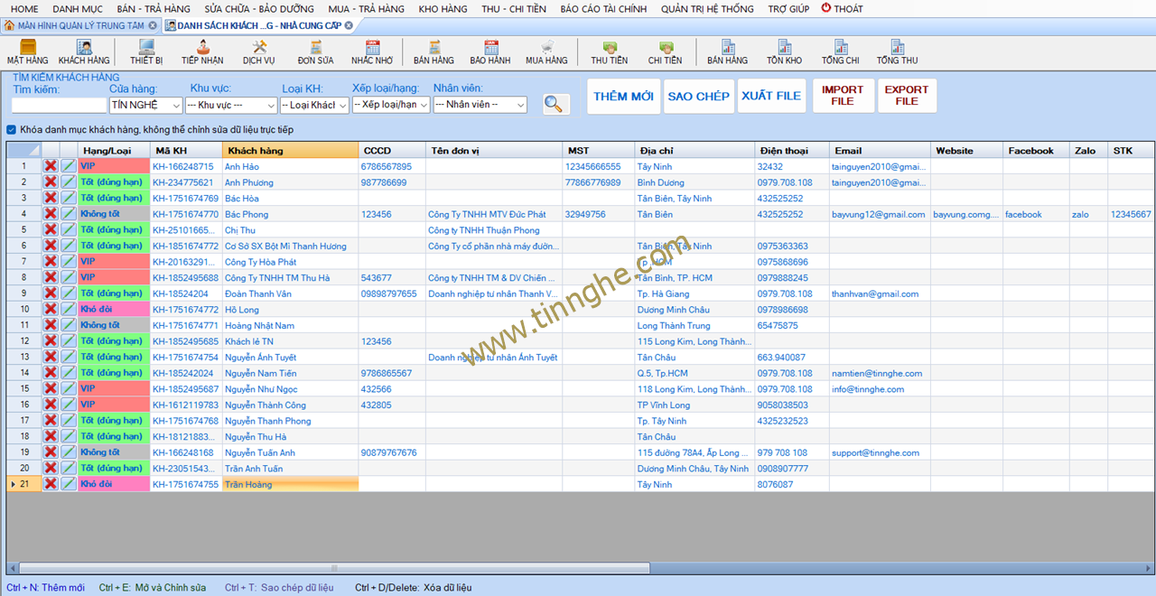 - Quản lý danh sách khách hàng, đối tác, nhà cung cấp, khu vực (Cho phép đưa dữ liệu khách hàng từ file Excel vào phần mềm)
