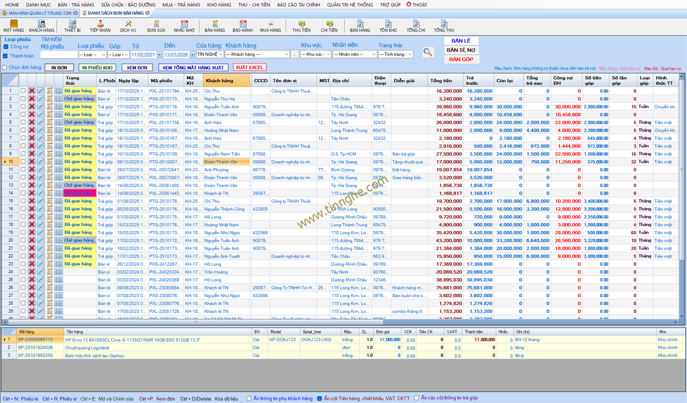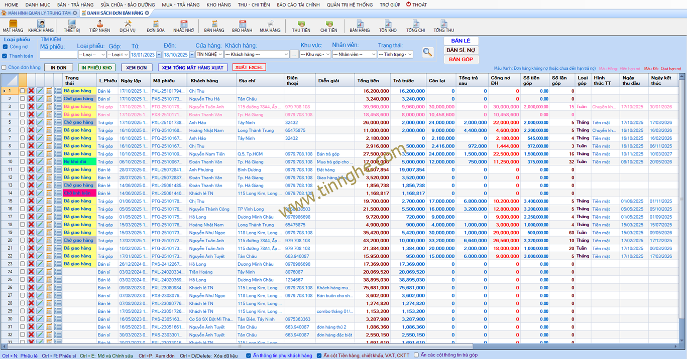 Màn hình quản lý đơn hàng bán lẻ-sỉ/trả góp cho phép lọc và tìm kiếm nhiều tiêu chí: Ngày tháng, khách hàng, khu vực, nhân viên...