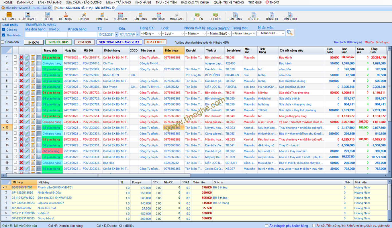 Xuất Excel chi tiết các đơn hàng sửa chữa, bảo hành và bảo dưỡng
