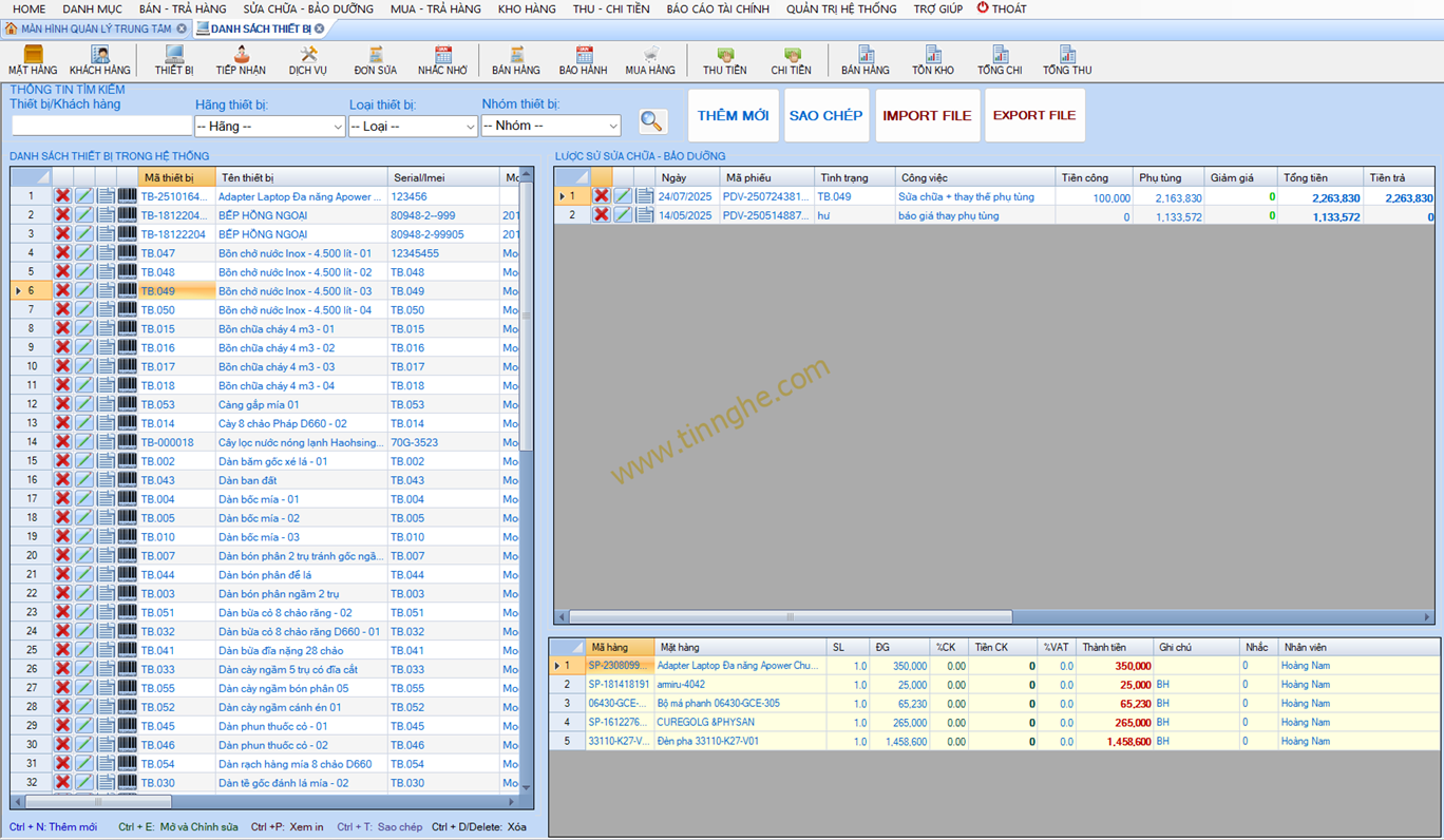 3. Quản lý dịch vụ SỬA CHỮA, BẢO HÀNH ,BẢO DƯỠNG THIẾT BỊ - MÁY MÓC (cho phép quét mã vạch mặt hàng/thiết bị, import dữ liệu từ file Excel vào phần mềm)