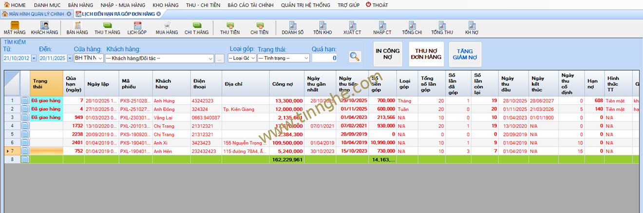 - Quản lý nhắc nhở ngày và số tiền phải trả góp trên từng đơn hàng đối với từng khách hàng cụ thể, đồng thời cho phép tăng giảm nợ trên từng khách hàng