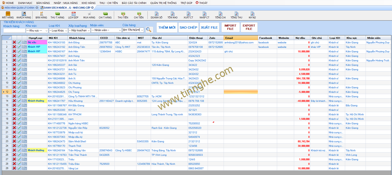 - Quản lý danh sách khách hàng, đối tác, nhà cung cấp, khu vực (Cho phép đưa dữ liệu khách hàng từ file Excel vào phần mềm)