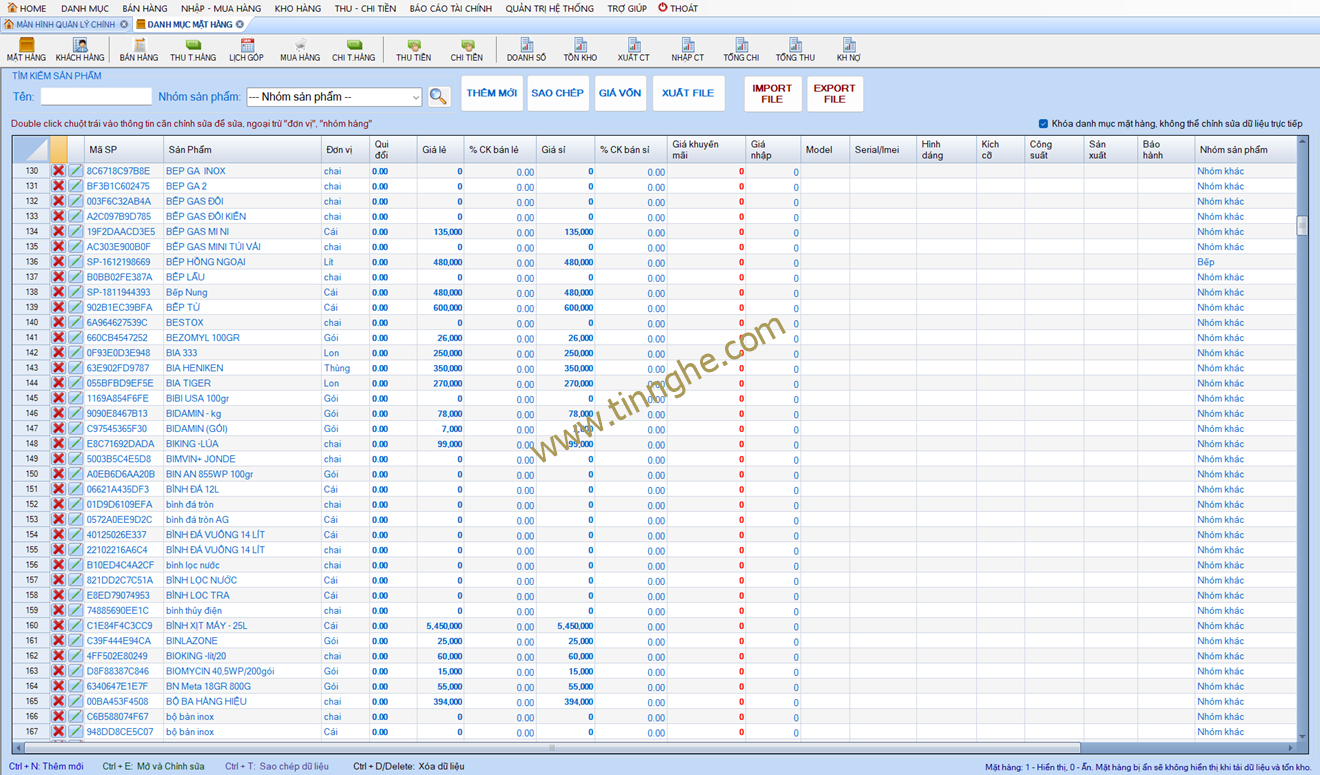 - Quản lý danh mục nhóm mặt hàng, mặt hàng. Ngoài thông tin căn bản của mặt hàng thì phần mềm hỗ trợ nâng cao 3 giá bán (giá sỉ, giá lẻ, giá khuyến mãi), 1 giá nhập, 2 đơn vị tính (1 đơn vị căn bản, 1 đơn vị qui đổi thùng), % chiết khấu sỉ và lẻ (Cho phép đưa - Import dữ liệu mặt hàng, nhóm mặt hàng từ file Excel vào phần mềm)
