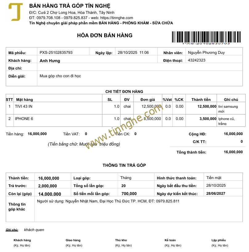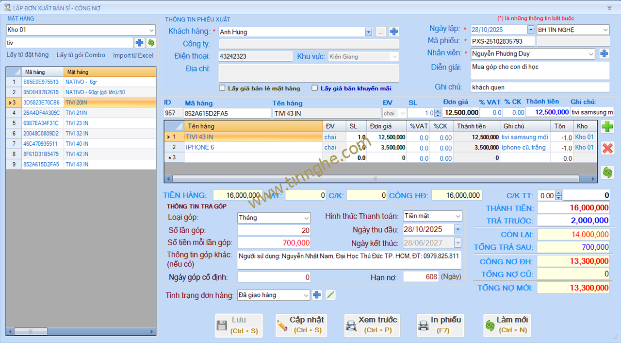 Phiếu xuất bán hàng có công nợ và thông tin trả góp