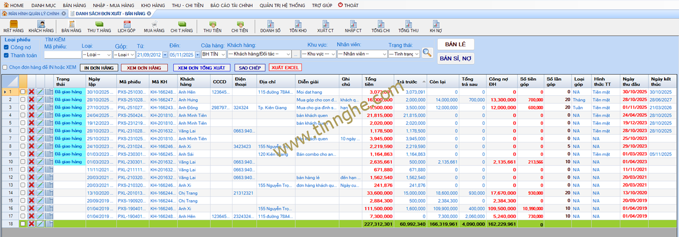 Màn hình quản lý đơn hàng trả góp hàng tháng cho phép tìm kiếm dễ dàng (mã đơn, ngày tháng, khách hàng, khu vực...), trên đơn hàng quản lý được số tiền thu hàng tháng, ngày thu, tổng số lần thu