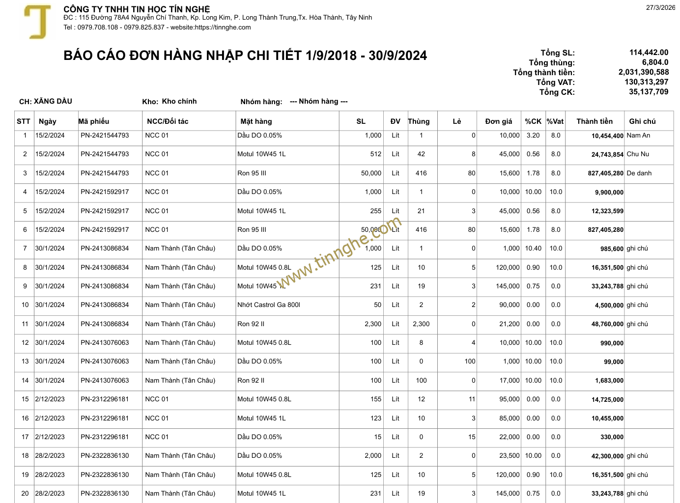 Báo cáo nhập hàng chi tiết