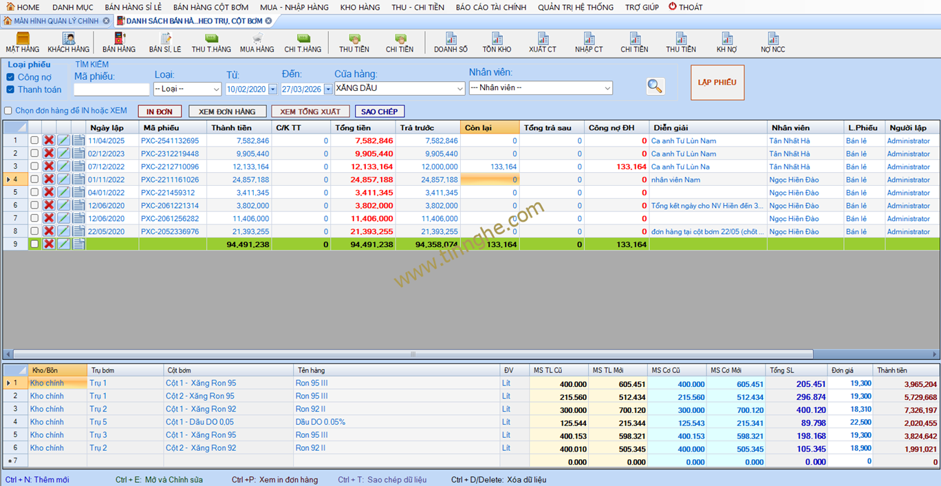 Đơn hàng bán công nợ theo trụ/cột bơm