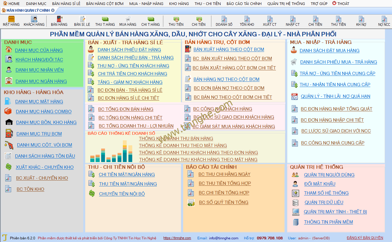 - Quản lý danh mục kho hàng (đa kho), trụ bơm, cột bơm.