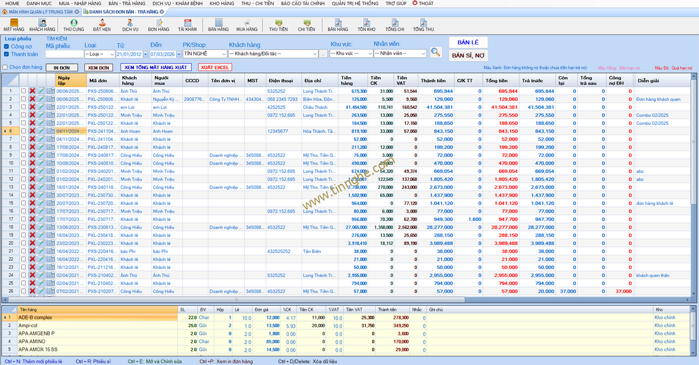 - Báo cáo công nợ và lược sử/sao kê giao dịch khách hàng (chi tiết giao dịch khám bệnh, mua hàng, trả tiền, ứng trước tiền, công nợ)