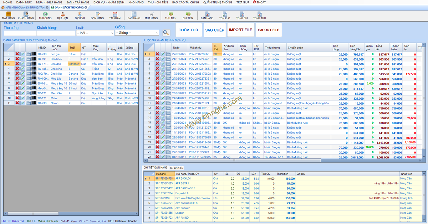 - Quản lý theo dõi dễ dàng danh sách thú cưng, chủ thú, lược sử khám (tiền khám bệnh, thuốc xuất, ngày khám, nhân viên khám, chuẩn đoán bệnh, triệu chứng, công việc) ứng với từng thú cưng và từng khách hàng khác nhau.